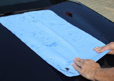Mit der Größe von 66 x 43 cm wenden wir uns speziell an professionell arbeitende Autoaufbereiter. In diesem Metier ist Zeit = Geld und diese(s) spart man schon, wenn man das Trockentuch seltener auswringen muß. Streifen- und fusselfreies Trocknen ist ebenso eine Selbstverständlichkeit, wie die Waschmaschinenbeständigkeit bis 30°C. Längst ist es üblich geworden, professionelle Techniken auch im privaten Bereich nutzen zu wollen. Mit der Einführung der zweiten Tuchgröße 43 x 32cm, werden wir auch diesem Kundenwunsch gerecht.