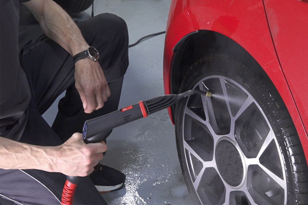 Tornador® STEAM is mobile, can be used with the steam nozzle, the triangular brush head and the rotating head. Steam is sprayed on to the surface and loosens the dirt from the pores of the surface. After this the dirt can be wiped off without and effort. The accessory kit contains: steam hose, handle, spot nozzle, triangular brush head and the Tornador® Rotate Set. Ideal for cleaning of the interior, the engine compartment, very dirty rims, the car body or also the paint.